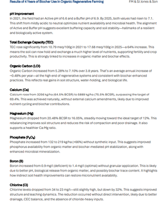 Practical on-farm trials have demonstrated measurable improvements in soil quality where biochar has been used alongside manure and regenerative grazing systems. Over a four-year period, soil testing showed: